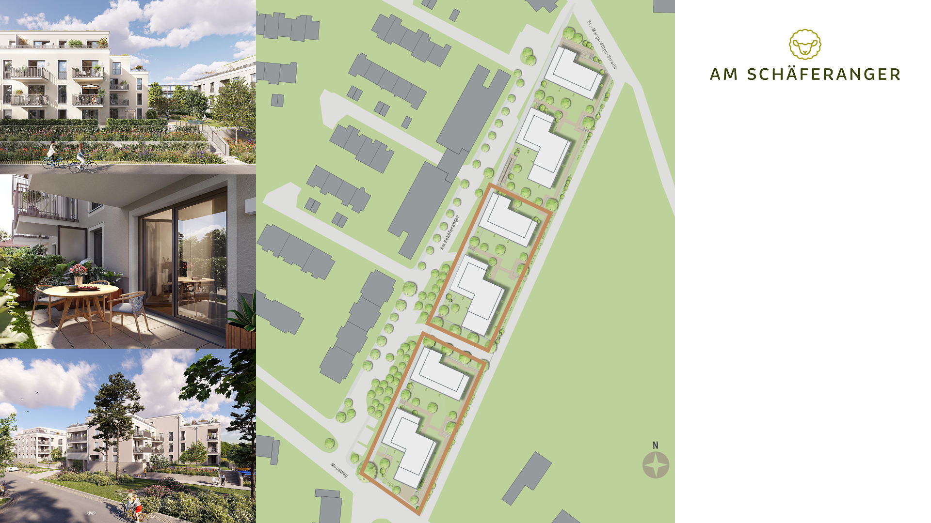 Der erste Bauabschnitt AM SCHÄFERANGER liegt am Straßenanfang Am Schäferanger Ecke Moosweg und umfasst die beiden Häuser 5 und 6 mit jeweils 20 und 30 Eigentumswohnungen. Mit Blick auf den weitläufigen Grünzug überzeugt der Bauabschnitt mit einer zentralen Mikrolage im Ensemble und schönen Details wie einer kleinen Kinderspielmöglichkeit und einem begrünten Hof. Ob modernes 1-Zimmer-Apartment zur Kapitalanlage oder großzügige Wohnung mit vier Zimmern zum Selbstbezug: hier findet jeder Lebensstil sein passendes Zuhause.
